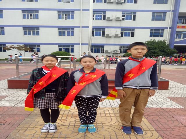 汤山小学第八周升旗仪式在学校操场如约举行。此次升旗手和护旗手是来自六(6)中队的孙思源、黄悦和谢子豪同学。