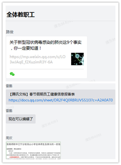 疫情阻击,正在关键时刻。学校是特殊防疫阵地,半点也不容马虎,当得知疫情时,汤山小学立刻成立以党员为核心的防疫领导小组,做好《防控工作方案》、《应急预案》。虽然是微信办公,在认识上大家都是统一思想,遵照上级部门的统一部署,分工到人、责任到人。