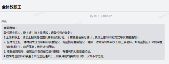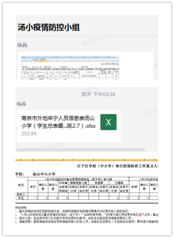 对外出南京学生信息进行梳理。按照区教育局、汤山街道的要求,1月31日发动班主任对外出南京市外学生信息进行梳理,重点筛查清楚学生外出何地、何时归来、交通方式、具体行程、来宁居住地址、身体状况等信息,并报汤山街道。