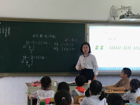 王秀花老师执教一(2)班《口算两位数减一位数(退位)》,在教学过程中,王老师比较重视学生计算技能的形成。首先,她鼓励孩子利用手中的小棒来摆一摆,通过引导学生进行操作、交流、讨论等活动,给学生提供充分发挥的空间,让学生充分地说,关心学生的情感,尊重学生自主的选择,保护学生自主发现的积极性,让学生获得成功的体验,增强了学好数学的信心。其次,她引导学生发现可以把新知识转化成旧知识来学习,渗透转化的数学思想,培养孩子转化知识和迁移的能力。