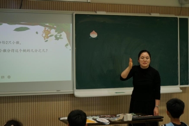 第二节课由江宁区学科带头人衡华丽执教三年级《认识一个整体的几分之一》。衡老师从猴子分桃的故事情境开始了这节课的探究之旅。首先制造冲突:是1/2,还是3/6?学生在交流讨论中思维碰撞,得到一个整体的概念。接着在小设计环节,不同的桃子数,表示出1/2。在第二个冲突中:桃子的个数各不相同,为什么都用1/2来表示,学生继续交流碰撞,概念上升到本质。而最后一个冲突:都是1个圆形,为什么用不同的数来表示。将整数和分数有机融合,学生的思维进一步提升。