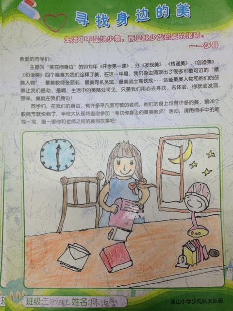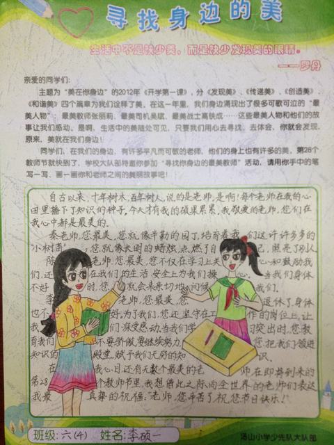 经过宣传发动,同学们参与活动的热情非常高涨。在活动作业卡上,他们有的用真挚深情的文字叙述了和老师之间的美丽故事;有的借助了七彩的画笔,绘出了心目中最喜爱的美丽教师形象;有的则拿起了手中的相机,记录下了老师工作时的美丽瞬间。一段段文字、一幅幅画面,饱含了学生们对老师的感恩与祝福,也让老师们体会到了身为人师的幸福。