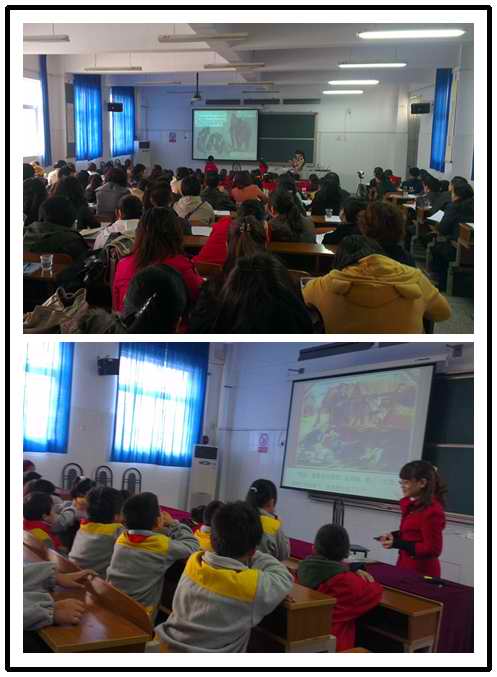 陈道佩老师用《让绘本阅读点亮孩子的心灵之灯》对四节课进行了点评,总结了四位老师“新、趣、实”的教学特点。谆谆告诫老师们学生语文素养的提升要三分课内七分课外,不是死教出来的。阅读绘本不要停留在原有的观念上,3-103岁都可以阅读。要打通绘本阅读与识字、口语和写作之间的通道。指导的形式要多样,各种方法要机动灵活。用“四多四少”对语文教学提出了希望。陈老师精辟独到的见解,使我们豁然开朗。细致揣摩四位优秀青年教师精彩课例和专家讲座,许多新的思路将注入到我校“坚守儿童立场 遵循语文规律”的绘本阅读主题校本教研活动之中。