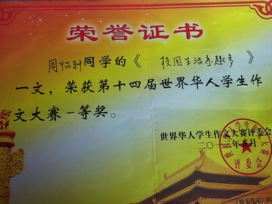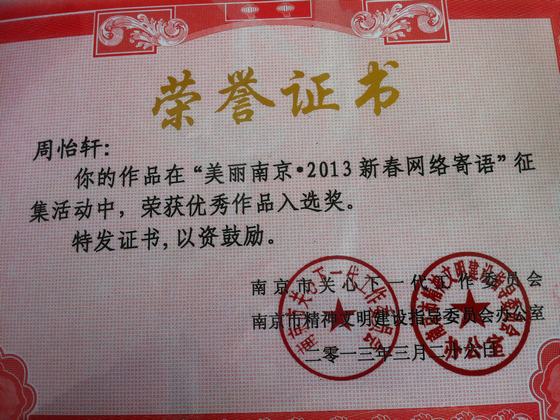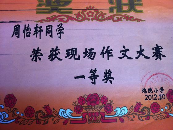 周怡轩同学2012年进入南京市江宁区汤山中心小学,现在为汤山中心小学五二班的学生。她性格文静,尊敬师长,团结同学,课余爱好是读书、唱歌、弹琴。在学校的历次考试中,都名列前茅;多次获得校三好学生的称号;五年级通过竞选,担任学校大队部学习委员。已经在张家口晚报、快乐作文上多次刊登文章。 她的妈妈是一位小学语文教师,从她识字的那一刻便开始教她读书,在父母的耳濡目染下,从图文并茂的绘本到纯文字的图书,从童话到科幻、侦探故事,从现代故事到历史故事,从百科全书到人物传记,她都读得津津有味,并且还会记下读书笔记,和父母交流其中的故事情节以及人物的性格特点。对她而言,读书如同吃饭、睡觉一样,成了她每天的必修课。广泛的阅读开阔了她的眼界,同时也提高了她的写作水平。她的作文经常被当作范文在同学中传阅,其中《校园生活乐趣多》一文,荣获第十四届世界华人学生作文大赛一等奖,在学校现场作文大赛中荣获一等奖,在“美丽南京。2013新春网络寄语”活动中荣获优秀作品入选奖。 书给她打开了另一个色彩斑斓的世界,书将永远伴随周怡轩同学的成长。