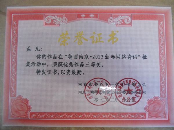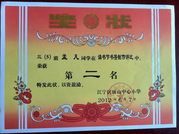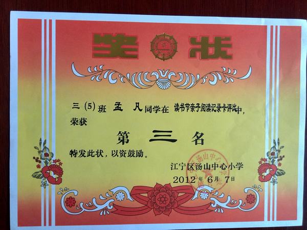 孟凡同学是汤山中心小学五年级5班的学生,她是个聪明可爱,阳光活泼的小女孩。 书,人们称之为人类文明的“长生果”。少年时代的读书生活恰似一幅流光溢彩的画页,也似一阕跳跃着欢快音符的乐章。每个人都有自己的读书经历,因为大家都知道书让我们受益匪浅。当一个孩子爱上书时,她就能享受读书带来的乐趣。双休日,去新华书店是她最大的乐趣。读书还有很多好处。能让我们更豁达、文雅、坚强,还能让我们增长知识,学会做人,懂得道理,收获快乐和帮助写作。 在持之以恒的阅读中,孟凡的思路随之开阔,在2012年江宁区中小学生“活力青奥 青春南京”读书节征文活动中荣获三等奖。在“美丽南京2013新春网络寄语”征集活动中,荣获优秀作品三等奖。 阅读已经成为她生活中不可缺少的一部分,爱书,读书,将阅读进行到底。