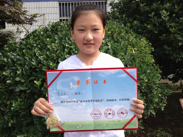 热烈祝贺言乐乐同学被授予2013学年度“南京市优秀少先队员”荣誉称号。